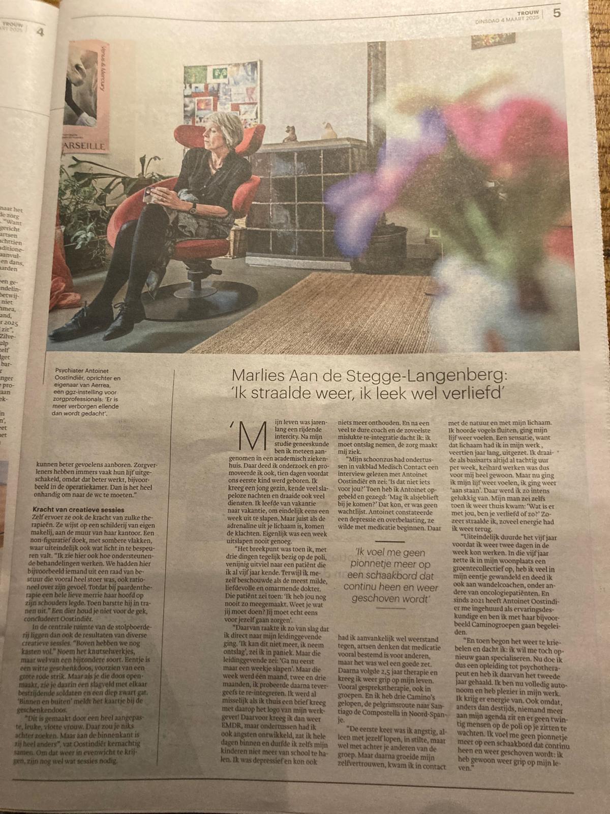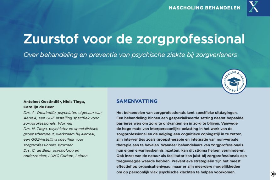 Mensen helpen die psychisch in de problemen zijn geraakt, en dan zelf vergelijkbare klachten krijgen. Antoinet Oostindiër richtte Aerrea op, die hulp biedt speciaal aan zorgverleners. Door middel van de natuur en therapie probeert ze met haar team zorgmedewerkers van hun psychische klachten af te helpen. De behandelingsmethodes slaan goed aan, maar Oostindiër heeft liever dat er iets gebeurt om de aanwas van nieuwe patiënten te stoppen. „Onder artsen heerst een cultuur waarin we elkaar gek maken.”